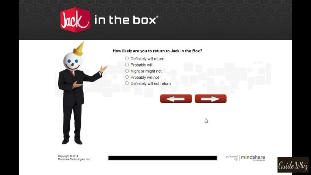 - It is necessary for you to click on the red buttons once you have finished answering each question in order to go to the next phase of the Jack in the Box poll. Now we get to the last phase. It is essential that you make a note of the Jacklistens validation number that the service gives you.